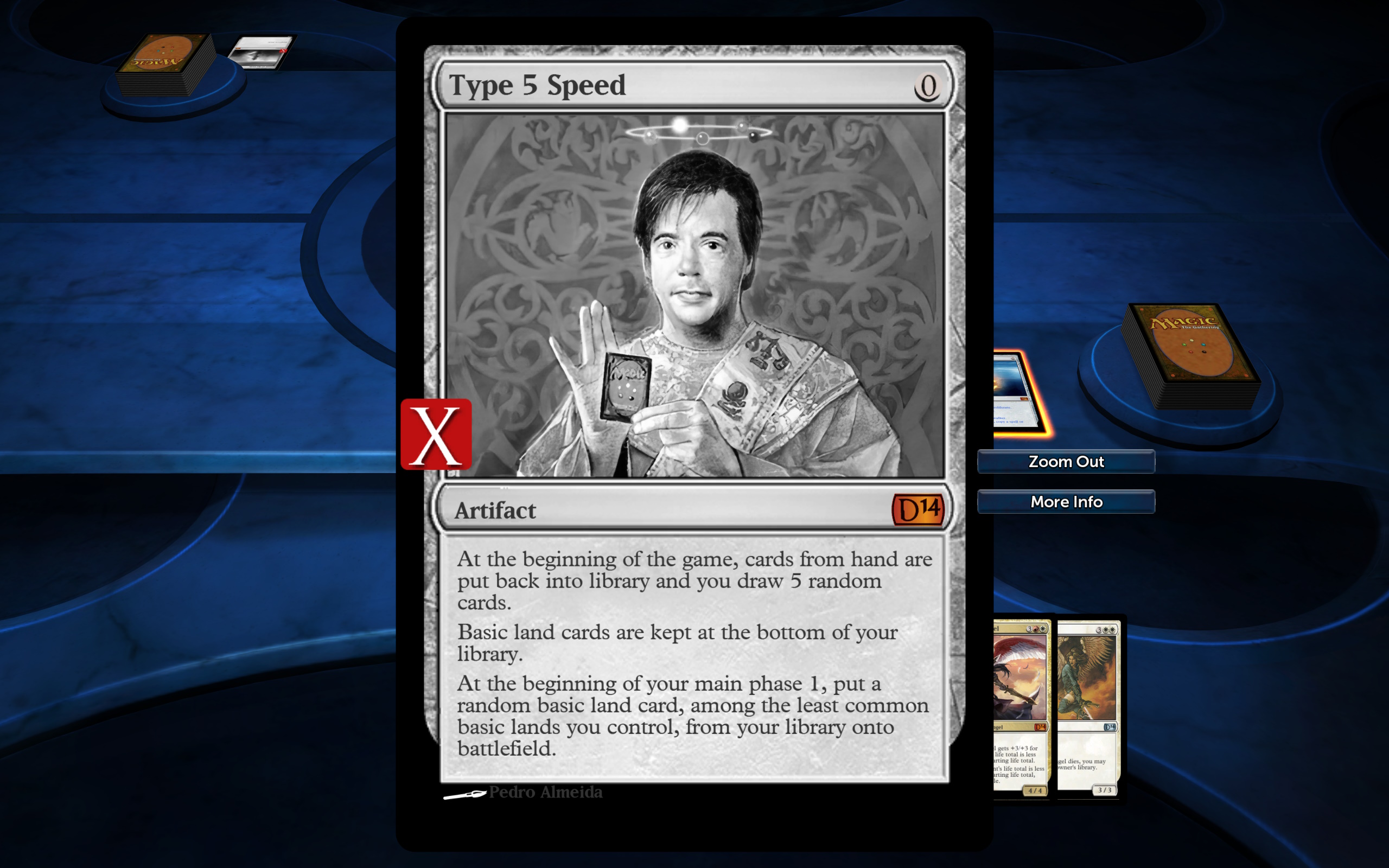 Transform cards are now "supported" also in "my version". They already existed, were finely coded and don't interfere with framerate. I didn't included them already because there was no way of knowing in what card it was transforming into and you couldn't play accordingly. But i've included this info now and you can get the info about the card the the transforming card will transforme into, Just Zoom the card and click "More Info" button to check the description about the card to transform into, Phyrexia: All Will Be One cards are coded and checked. Only some cards from it's Commander are missing (the hard ones). Maybe ,next, i'll be coding the transform cards left behind and try to code Prototype cards before moving to newer sets.