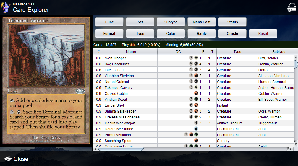 You can now sort cards in the explorer by player rating (from Gatherer) by clicking on the # column. The rating can be from 0.000 to 5.000. The actual value displayed is rounded to one decimal place but the full 3 decimal places are used when sorting. The rating for every card is updated on each new version release. Missing cards have a default rating of 2.500.