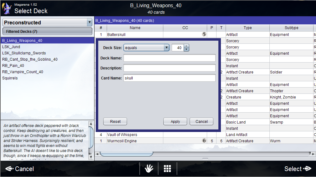 I have started to look at improving the deck selection code. First, I have replaced the (deck) file open dialog in the deck editor with a new screen which will eventually be the goto screen for choosing or generating a deck.