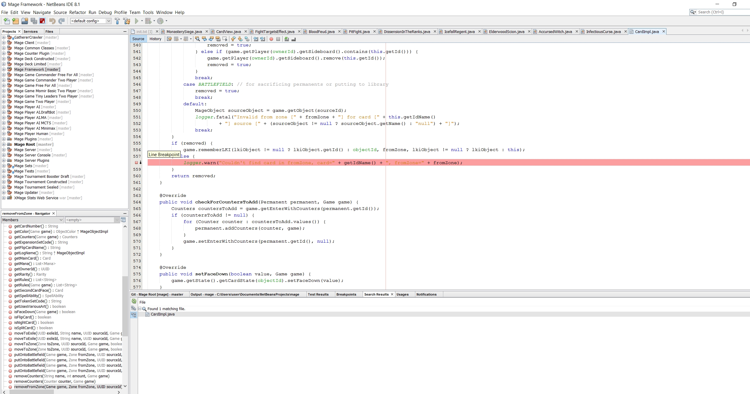 How would I do that on already compiled code? Or do I have to compile the whole source in order to do that?LevelX wrote:I would set a breakpoint to CardImpl->removeFromZone Line 558 to get at least a stack trace, when this happens. From this you can analyze more deeply, why this is happening.