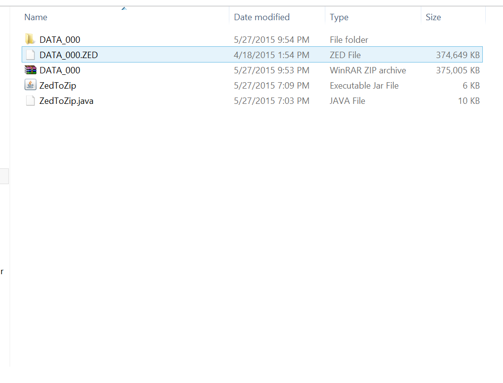 It loads "DATA_000.ZED" file from current folder and creates a standard zip file named "DATA_000.zip".