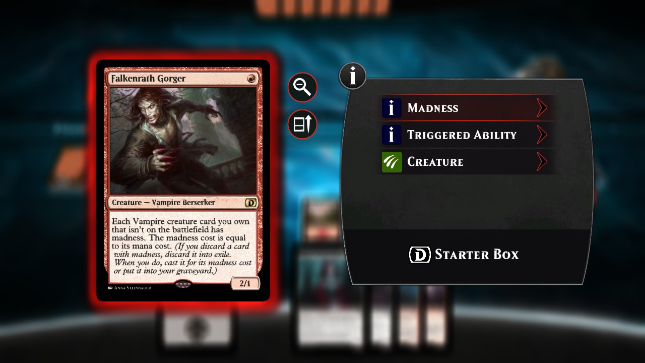- Falkenrath Gorger: tested, and it works, even if not perfectly: cards that already have a madness cost won't present the choice between the 2 different madness costs. It seems that the madness cost already on the card wins, which is good because it's usually the cheapest one. Also, when choosing a card to discard, cards with intrinsic madness cost glow light blue, while cards whose madness is granted by the Gorger glow red as if they had no madness cost (this is only a cosmetic incoherence).