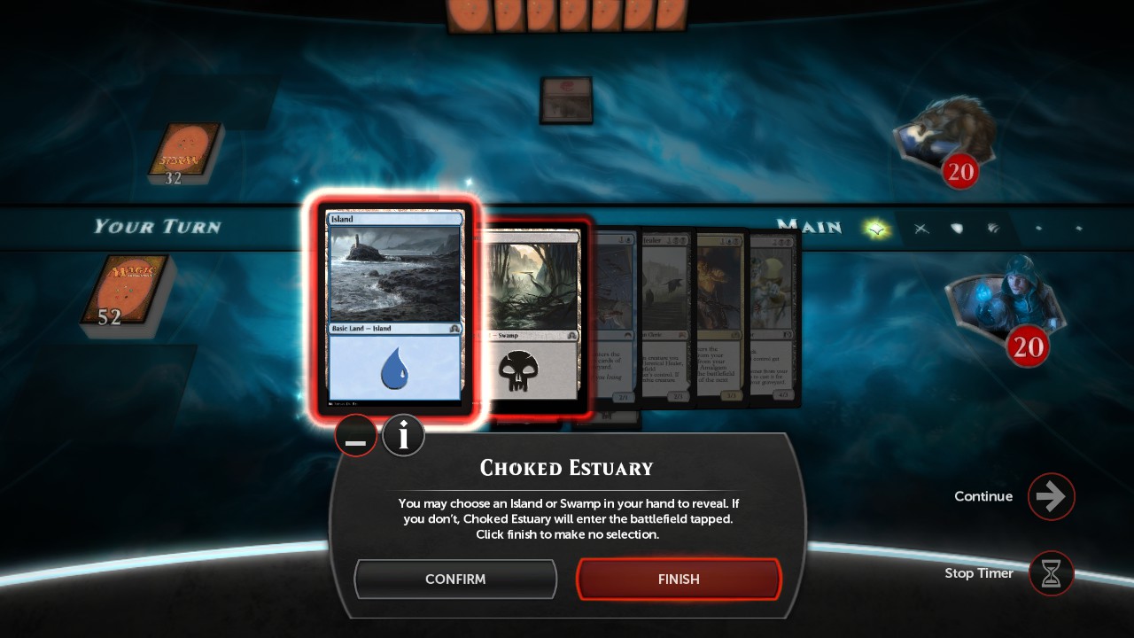 <LOCALISED_TEXT LanguageCode="en-US"><![CDATA[You may choose an Island or Swamp in your hand to reveal. If you don’t, Choked Estuary will enter the battlefield tapped. Click finish to make no selection.]]></LOCALISED_TEXT>
