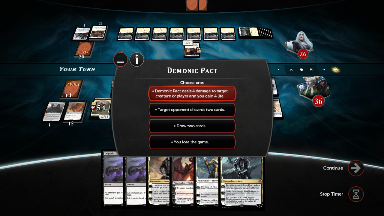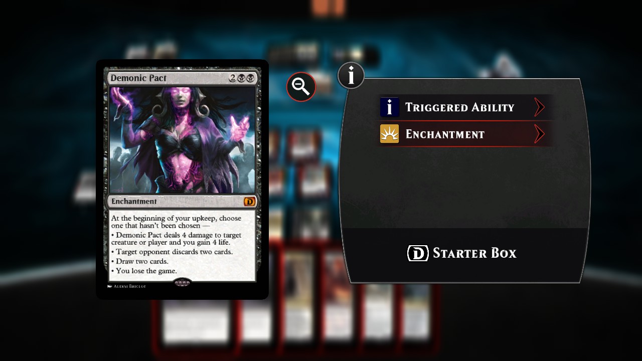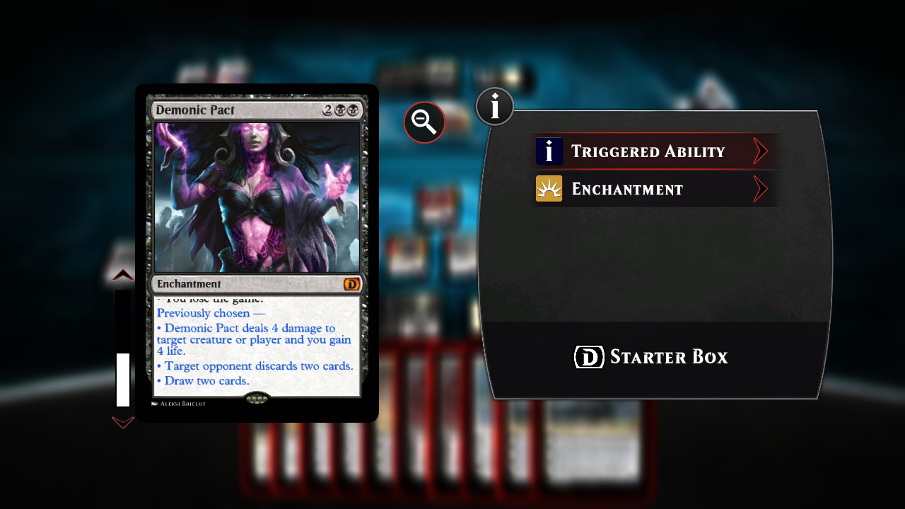 I also attempted to code Demonic Pact by experimenting with an idea I had, but with no success: the problem is that we can't put conditions on the choices directly. We can put them on the targets, so I could have made it work if all 4 choices required targets, but since this is not the case, I couldn't. I might have another idea, but I can't promise anything.