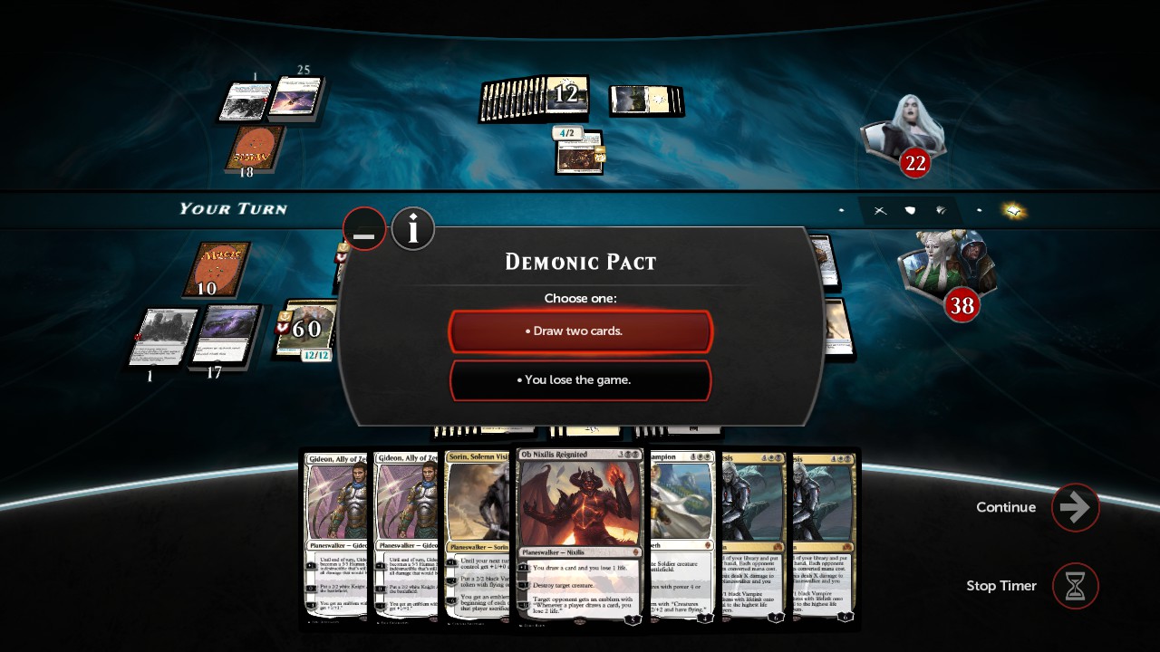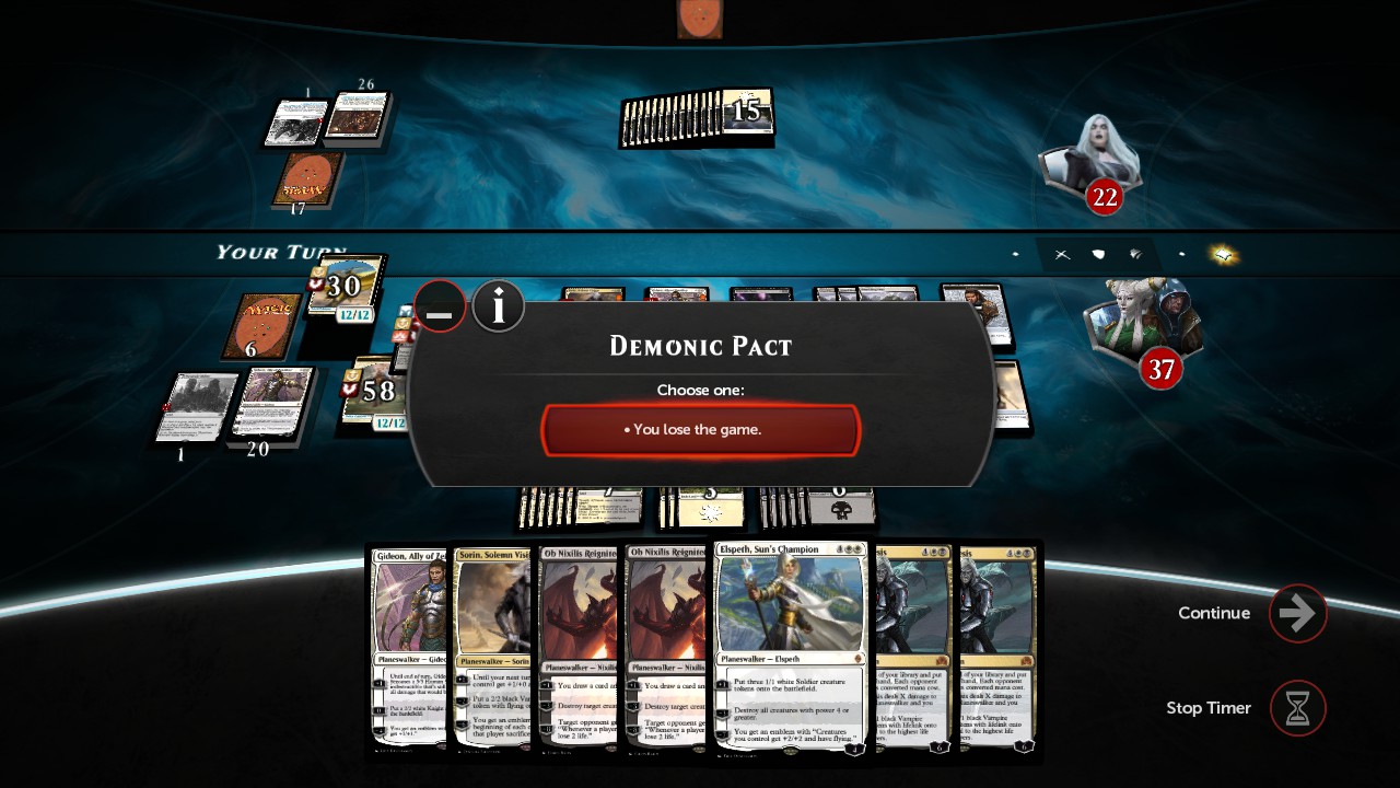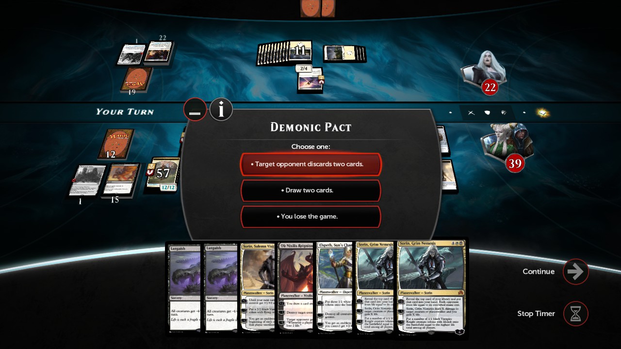 thefiremind wrote:I also attempted to code Demonic Pact by experimenting with an idea I had, but with no success: the problem is that we can't put conditions on the choices directly. We can put them on the targets, so I could have made it work if all 4 choices required targets, but since this is not the case, I couldn't. I might have another idea, but I can't promise anything.