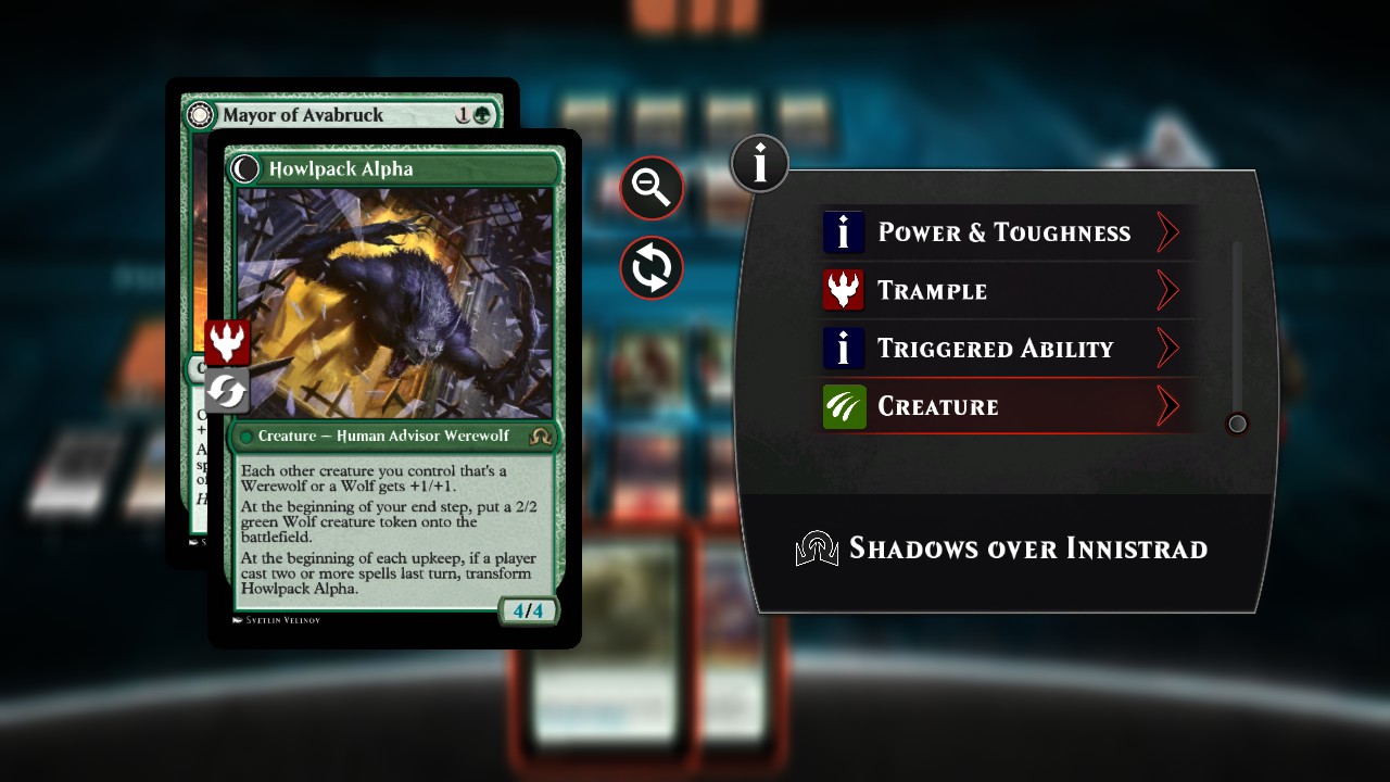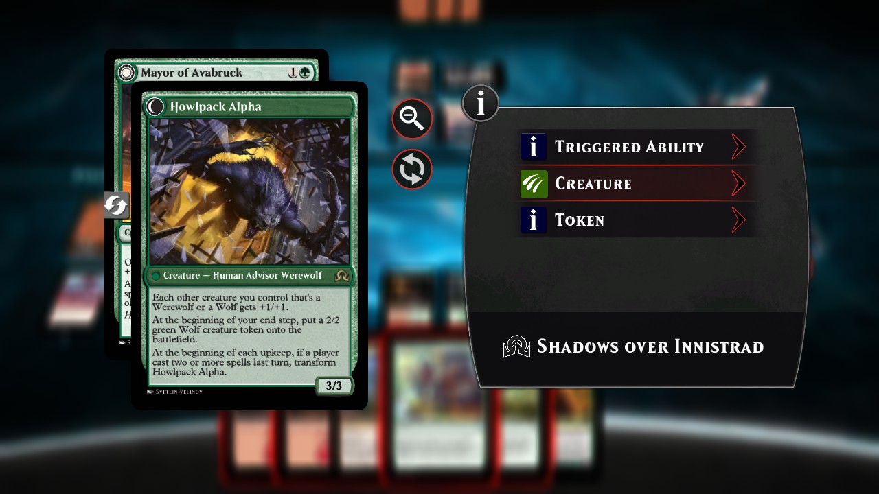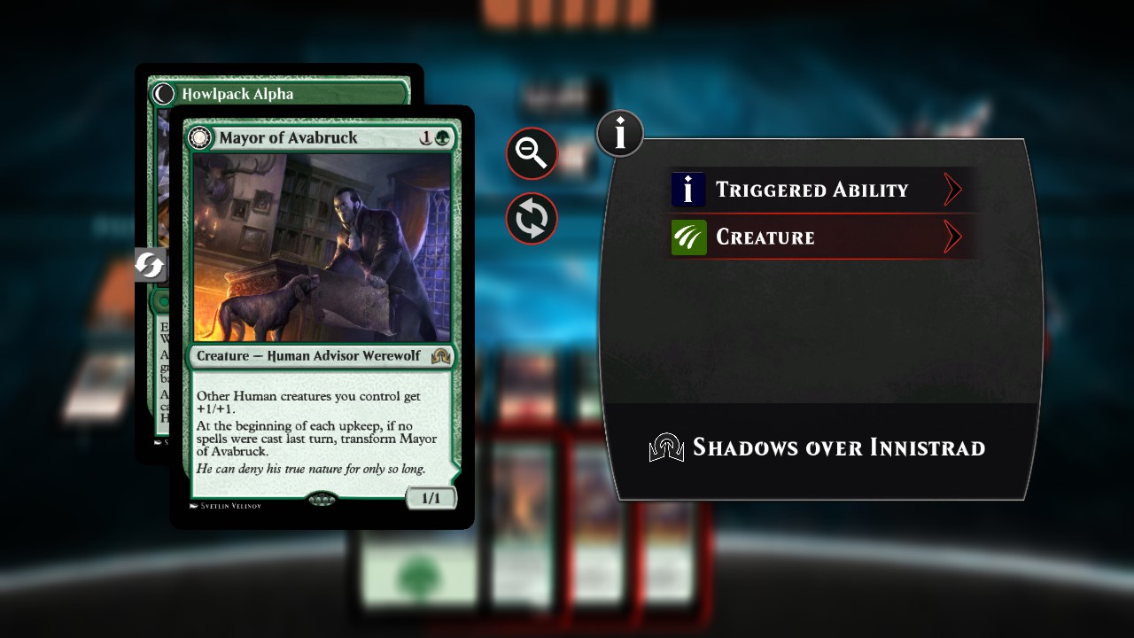 Okay, here is what I discovered after making Mayor of Avabruck. A long time ago, I started using the CARDNAME for the ARTID of cards I code because that helps me find the illustration quicker if I want to change it or delete it. Since that day it's something I've always done. Thus, I used the same method on Mayor of Avabruck and noticed that the transformation would occur and the card functioned as it should but the illustration would be the one used for the front of the card even when the card flipped. It seems that transformation cards must use numbers for them to function properly. You'll notice in the 'Not considered a double-faced card' screenshots above that the rotation icon is not even on the card in the foreground because it's not considered a double-face card. The MORE INFO BADGE doesn't even appear in the information box if the value of the ARTID doesn't use numbers for transformation cards. This is an indicator that the card is not coded correctly. TFM, perhaps a more concise paraphrase of this information should be included in the opening post.