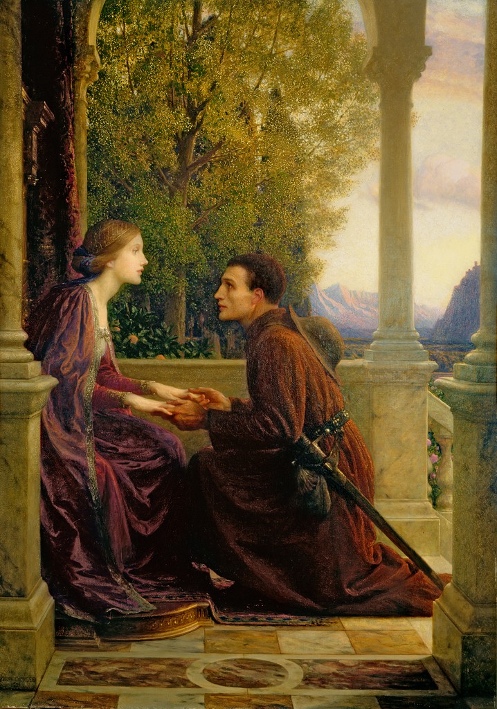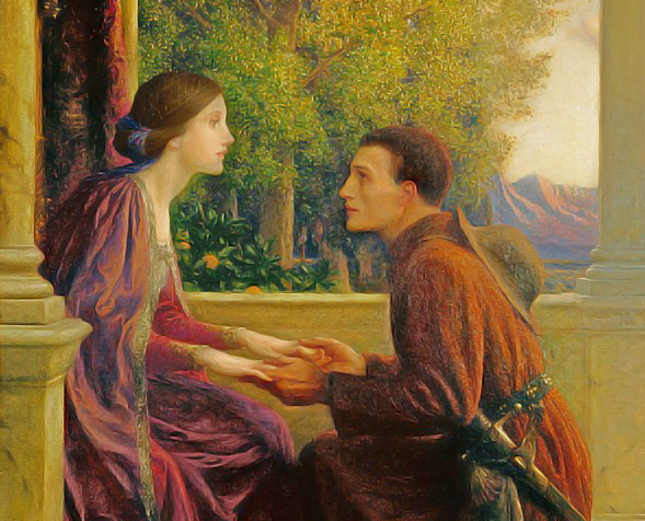 I think we should select a more appropriate image for this card's rendering, in honor of Quinton Hoover. I'm a fan of "The End of the Quest" by Sir Frank Dicksee, attached. Still, this art doesn't match the style of Quinton Hoover at the time the card was created. His pen-and-ink technique lended itself to bold strokes and pastel colors. I've applied some filters in Photoshop to "The End of the Quest" to approximate Quinton's palette, but I cannot mimic the ink effect. I also darkened the hair of the woman, Richard's girlfriend was Asian and likely had dark hair.