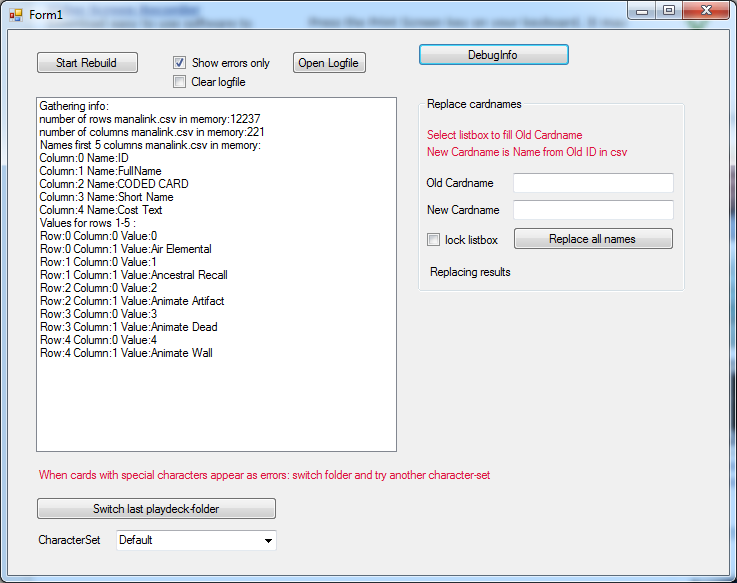 I'm having the same problem where is seems that all my cards need replaced and it doesn't have any suggestions for new card names. Using your new debug option, I see some interesting results. Using the CSV from Mok's latest version (xls_csv.rar), it seems to fail to retrieve correctly the column names starting with Column 2. I seem to have more rows, but fewer columns in memory as well...