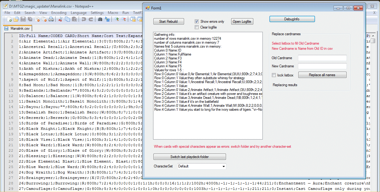 Therefore I'll change the whole program by simple read each line and use ';' as the separator, since that is now the separator in the manalink.csv provided by Mok/Gargaroz. I hope it stays that way, otherwise i get problems with cards like Kongming, sleeping dragon, and all other cards with a comma in their name.