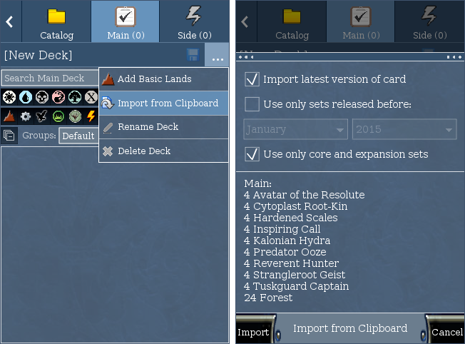 I just released 1.5.39.001, which, in addition to including recent fixes released with the 1.5.38 Beta, includes new support for importing decklists from the clipboard. You simply copy a decklist to the clipboard from the forums or a text editor, open the app, and click a new "Import from Clipboard" option in the deck editor menu. You'll then see a dialog like this, with the same options available on the Import dialog of the desktop application. Then all you have to do is click "Import" and you'll have your deck.