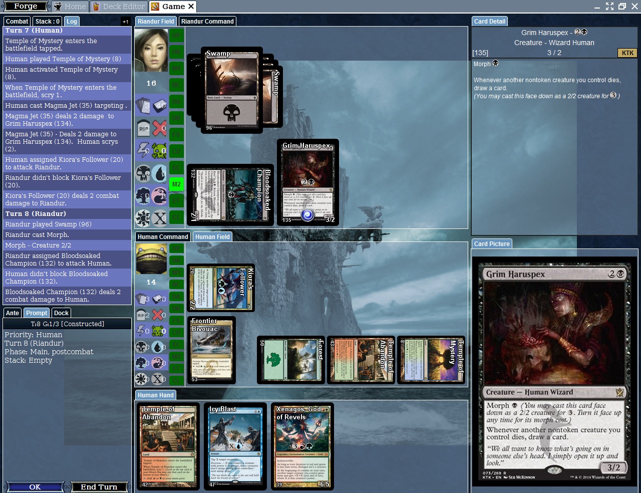2) In another game, AI cast Grim Haruspex as a Morph. However, I see it as a 3/2 face-up creature (see screenshot).