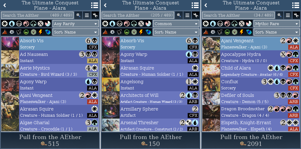 I will note that I'm developing a slick reward system to make it easier to find cards you're looking for, which I'll reveal more about soon. The one thing I will reveal is that, inline with the goal to collect all the cards, you will not be able to sell cards in Planar Conquest. Instead, duplicates opened in boosters will be automatically converted to credit you can spend to unlock more cards.