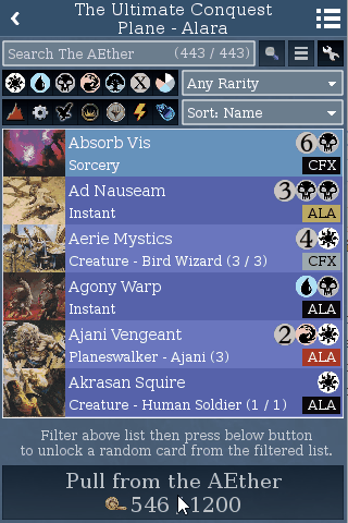 Time for another Planar Conquest update. Today I'm going to reveal "The AEther", which is Planar Conquest's version of Quest mode's spell shop. Instead of having a randomly generated pool of singles, packs, and boxes to purchase (along with the ability to sell your cards), The AEther is essentially a slot machine where you press a button to "pull from the AEther" a single card.
