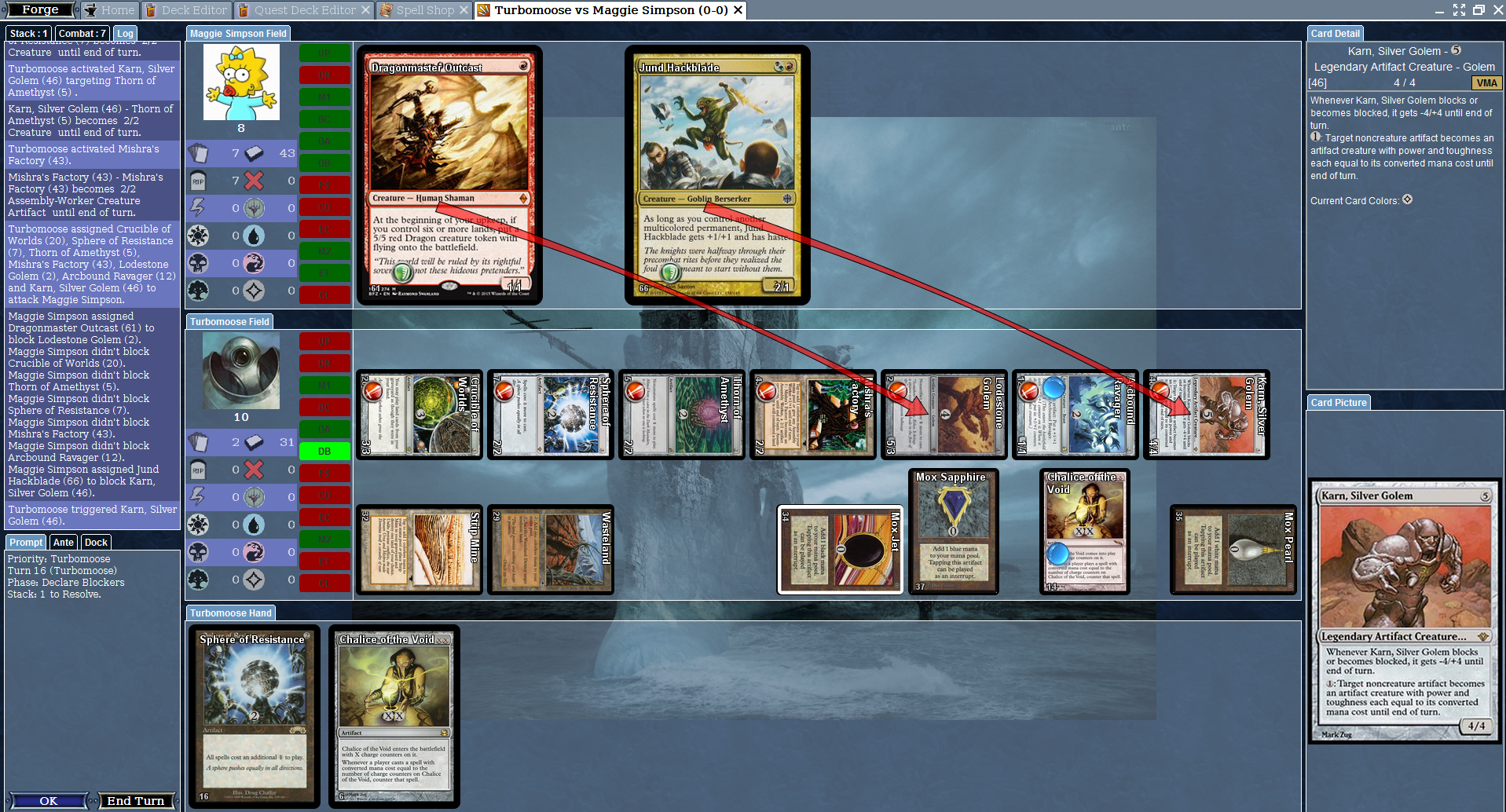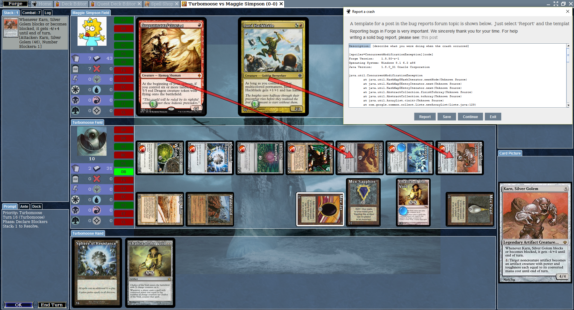 Description: Used Karn, Silver Golemn to make several artifacts into creatures then attacked with them all. Karn has become blocked and the triggered -4/+4 ability is on the stack. Screenshot included.