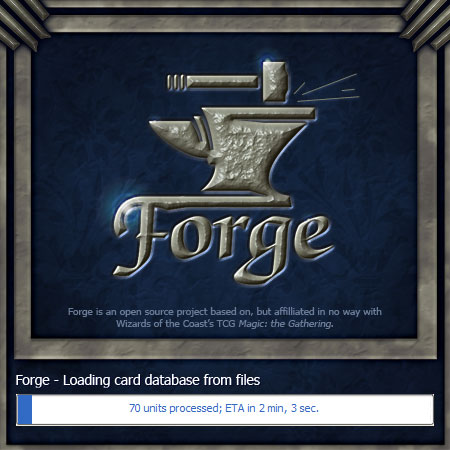 i doubt we need a splash screen. we now load the card DB after the user selects an activity from the Forge main screen. this was a pleasant side effect of making the alternative LazyCardFactory available to unit tests. the forge main screen appears really fast now. if your changes are going to make the main screen appear more slowly, then we might want a splash screen.moomarc wrote:forgeSplash.jpgI decided it would just be easier to base it on the current one to make implementation as easy as possible.