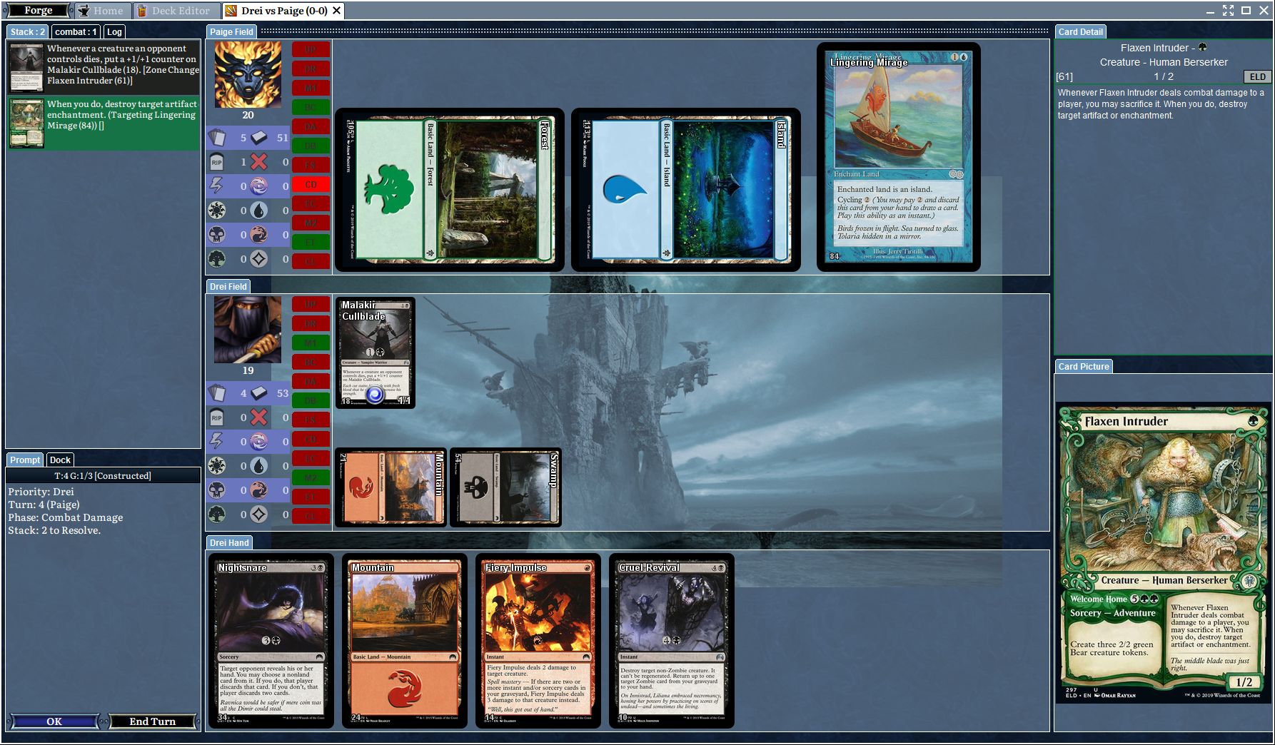 Next round, the AI attacks with its only creature, a Flaxen Intruder, and does one damage to me. Next it sacrificies it and uses the corresponding ability to destroy the Lingering Mirage