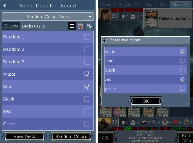 You actually can (and need to) select multiple colors at the same time (by holding ctrl or shift). See Tablet of the Guilds.Davor Vitief wrote:Ok, you are right, but i think this should work like the desktop Forge where you can't choose two colors at the same time, therefore you don't need to deselect white, i think is more intuitive too.
