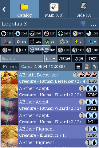 I've gone ahead and revamped the card color, card type, cmc, and deck color toggle filters a bit to make them more usable. Since there is no right-click, I had previously made long press mimic the behavior of right-click on the desktop game, which shows only cards that match the right-clicked filter. However, I've found this to really be the most desirable behavior for these buttons most of the time, so having to long press was kind of annoying.