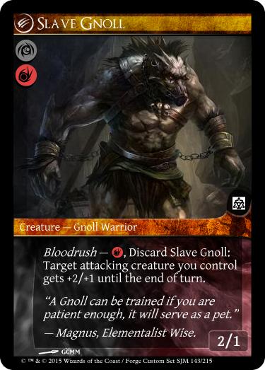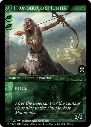 My set is based in the plane of Arden. A plane divided by war between humans and many humanoid species. The first set will be the nonhumans species who are facing the extinction against the human armies. I hope you like it. When I release the final version will come with the scripts, the images, a new world with decks and challenges. Of course it will take a while.