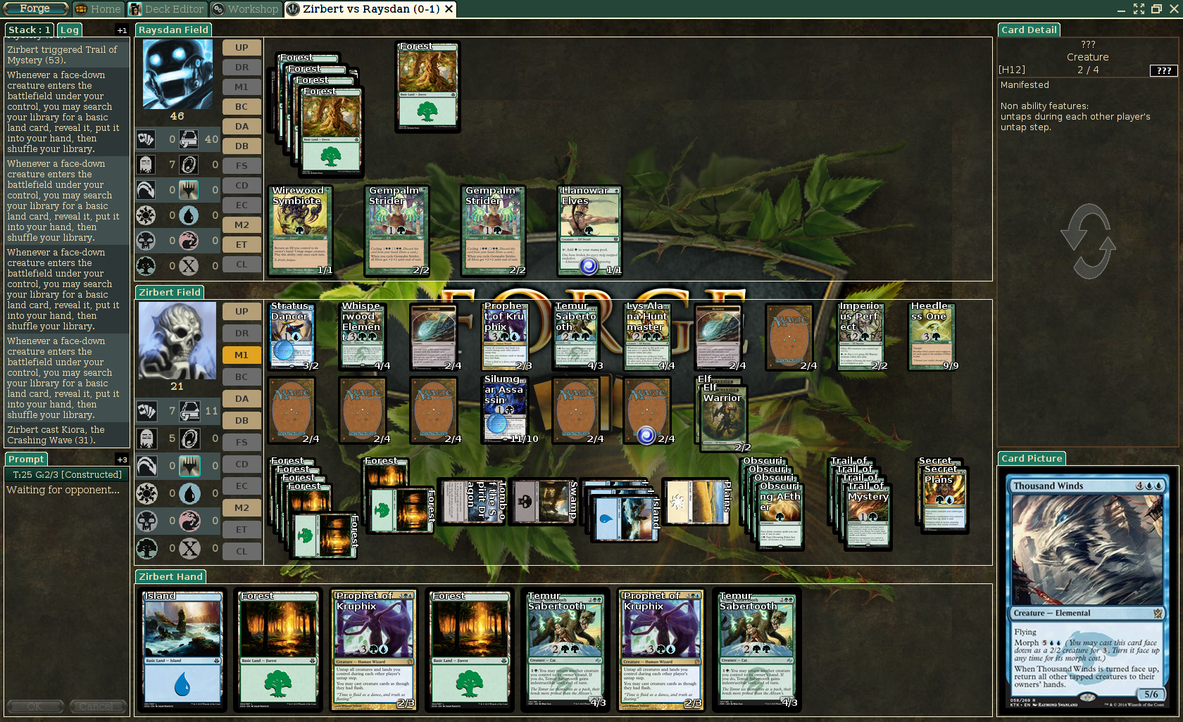 The AI cast Sift Through Sands from my hand using the effect of Mindclaw Shaman, then on a subsequent turn, cast Archaeomancer and illegally used its effect to return Sift Through Sands from my graveyard to my hand (there were no instant or sorcery cards in the AI's graveyard at the time).