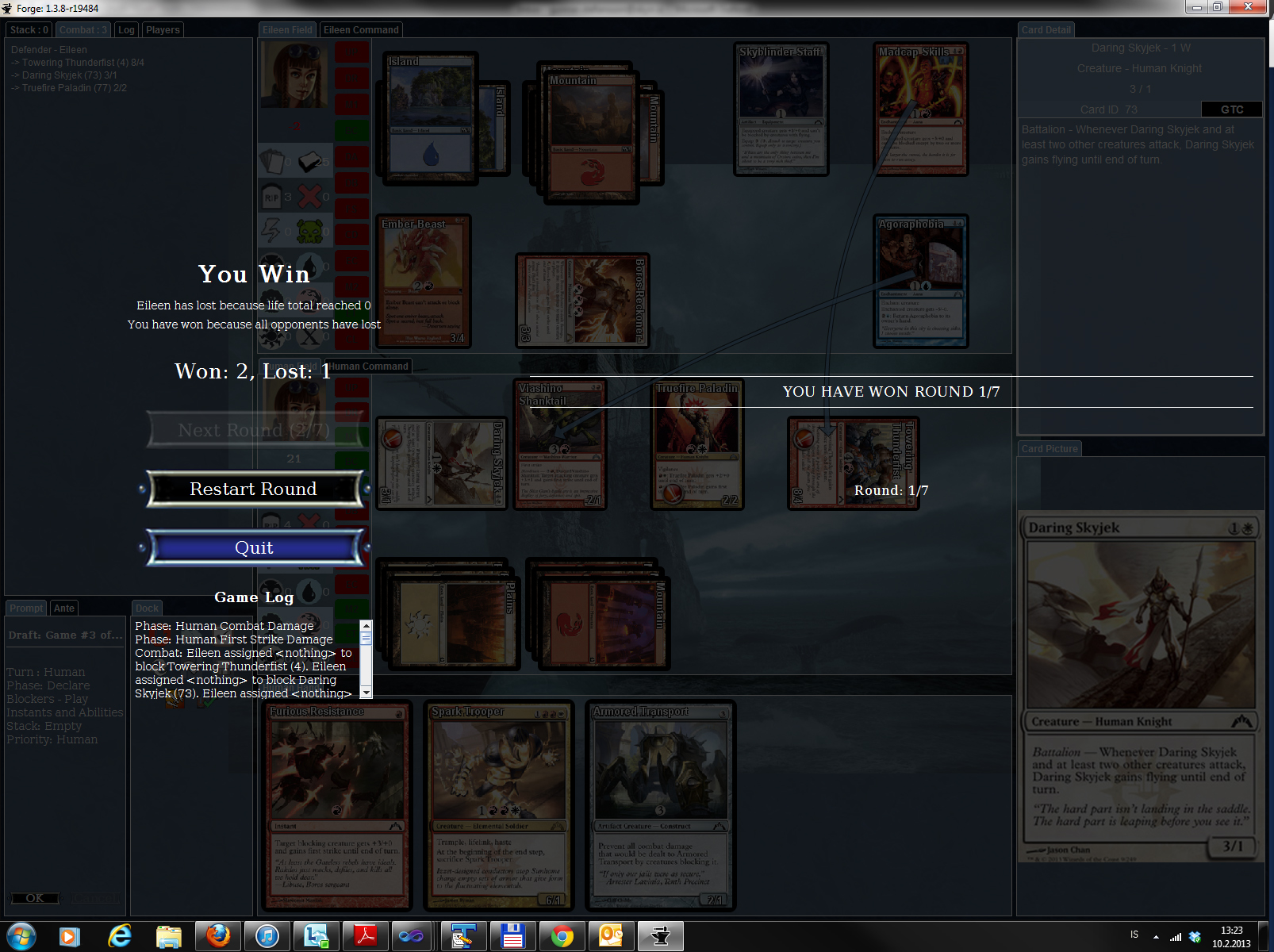 Combat: Eileen assigned <nothing> to block Towering Thunderfist (4). Eileen assigned <nothing> to block Daring Skyjek (73). Eileen assigned <nothing> to block Truefire Paladin (77).