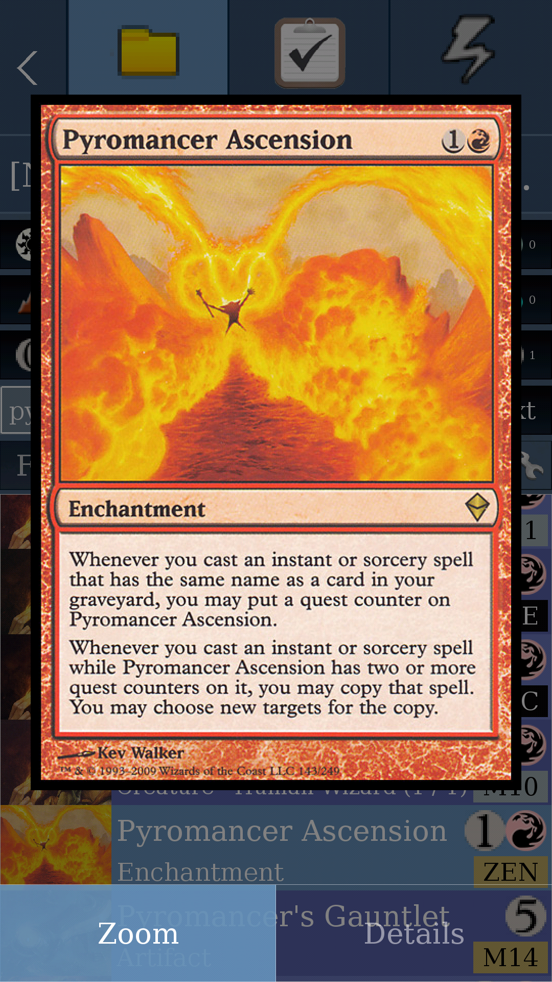 I recently installed this app and have been loving the ability to play mtg on the go but I just tried to add my Storm deck to get some practice in but the app doesn't seem to have the card 'Pyromancer Ascension'. Any ideas why this is?