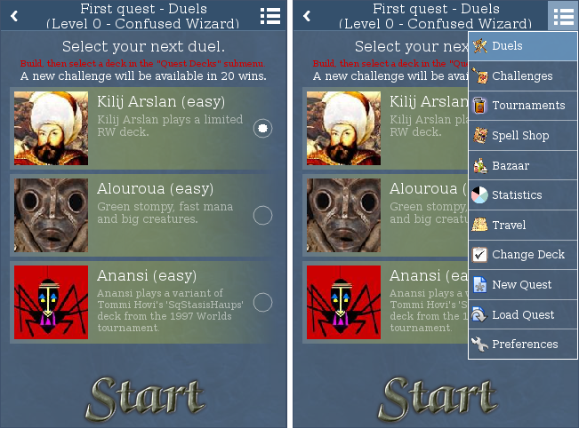 The Duels screen is pretty straight forward. Three options and a Start button, with a couple labels above indicating how your current deck (or if you need to select one), as well as the number of wins required to unlock the next challenge. At the top of every quest screen will be the quest name, the screen name, and your current level/rank.