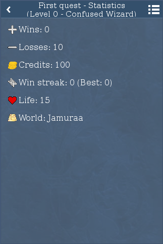 The Quest menu can be dropped down from the button at the top right of the screen. It has all the different Quest screens you'll be used to accessing from either the home screen submenu or buttons on one of the quest screens. This allows easy navigation between quest screens without a dedicated quest menu screen. It also allows having parts of the screens, like stats, be easily available to display on their own screen without taking up room on other quest screens. For example, here's the screen for displaying Quest statistics which appear on the bottom right of other quest screens on the desktop game.