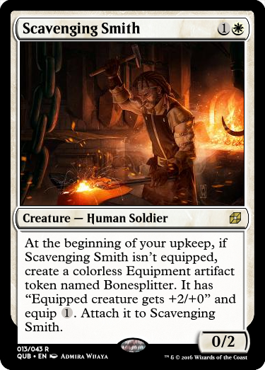 Oracle:At the beginning of your upkeep, if Scavenging Smith isn’t equipped, create a colorless Equipment artifact token named Bonesplitter. It has “Equipped creature gets +2/+0” and equip 1. Attach it to Scavenging Smith.