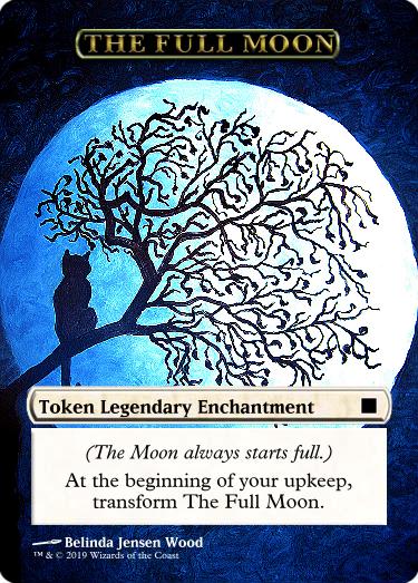 This is an implementation of the Flux mechanic from a popular r/custommagic post by u/Spiderfuzz. It creates a moon under your control, a double faced token enchantment that transforms at the beginning of your upkeep. It begins as "The Full Moon", then transforms to "The Dark Moon", then transforms again and so on. It doesn't really do anything by itself, but other permanents and spells might care about its state.