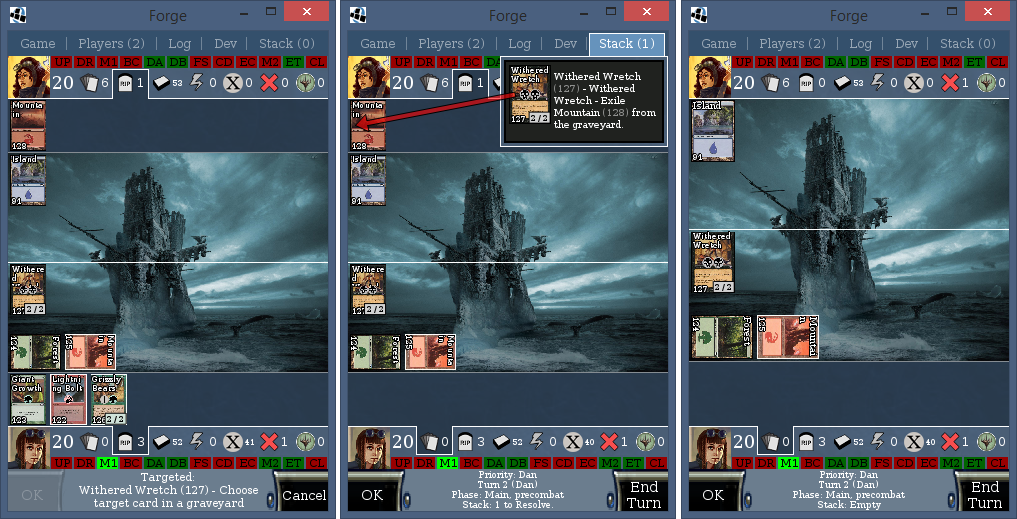 As you can see, I've made it so only the active stack item will display targetting arrows, which should prevent a cluttered mess of arrows if the stack has many spells or abilities with varying targets.