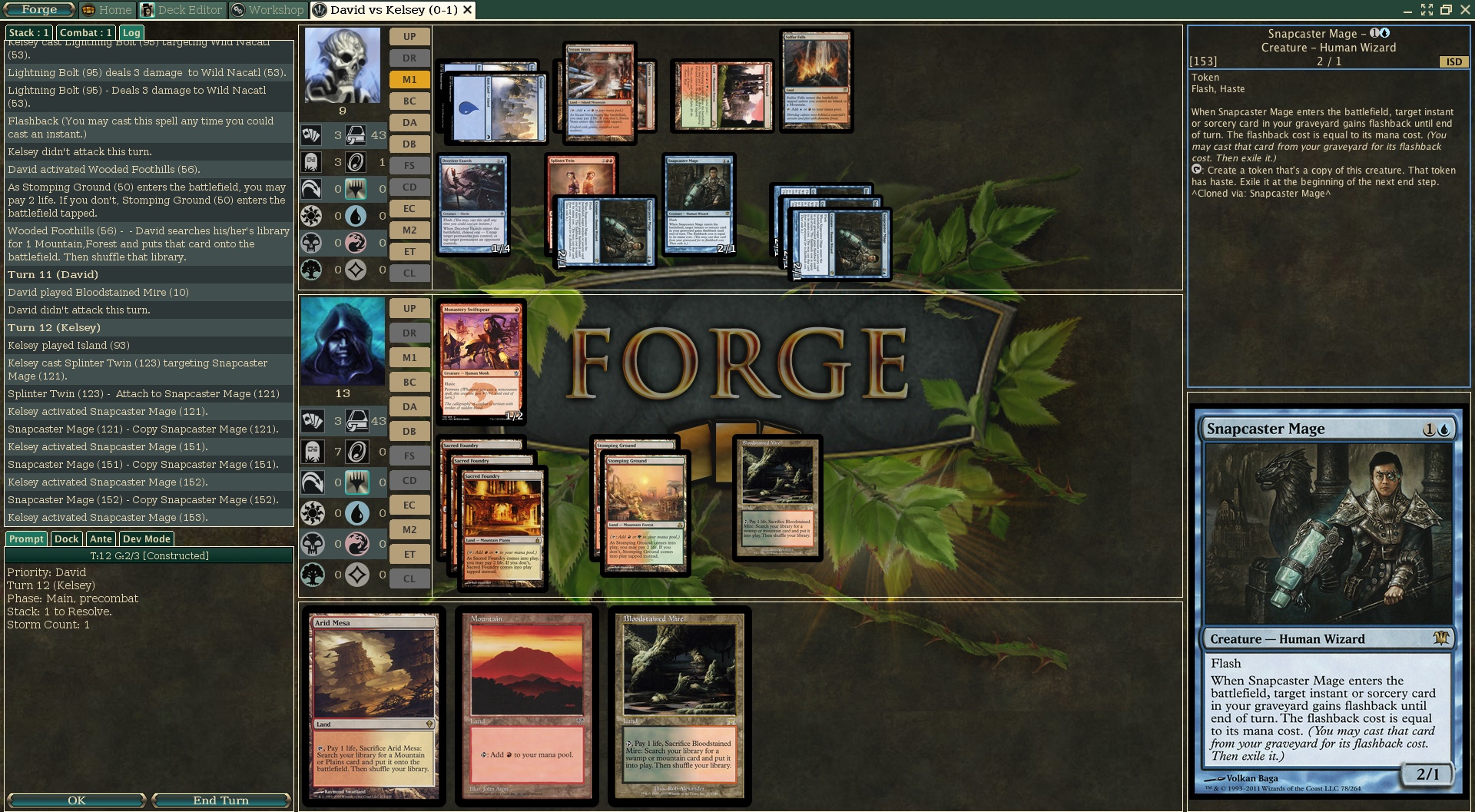 Something went wrong with Splinter Twin. It appears that when a creature enchanted by Splinter Twin activates the ability that Twin gives it, the tokens are also coming with the Splinter Twin ability. So in the below example, the AI has enchanted Snapcaster Mage with Splinter Twin and made a Snapcaster Mage token. The token made another token, which made another token, which is making another token, etc. The AI decided to make enough tokens to crash the game.