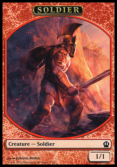 As an example, this token is named r_1_1_soldier.jpg. To make it show up in the game when playing with Theros block cards, the file's name should be r_1_1_soldier_THS.jpg. Should you come across any tokens that don't appear in the game, make a copy of said token an add the _ character along with 3 letter set abbreviation name that it comes from. Keep the original token in the folder as well.