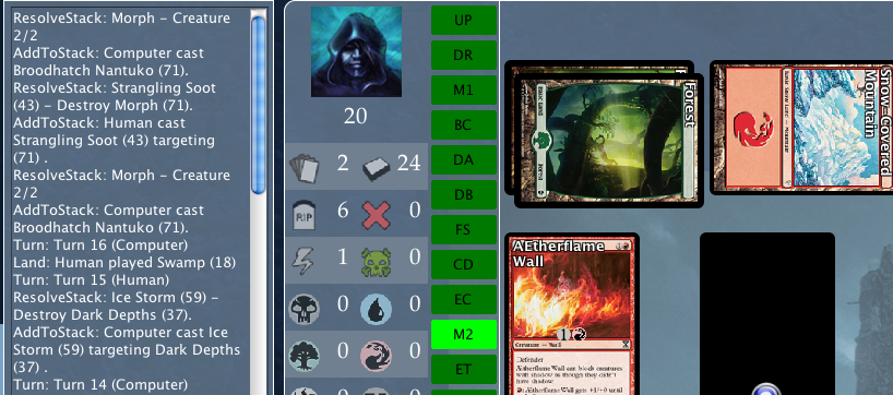 Fixed! Thanks tafkad. But please post bugs in the developer version here: viewtopic.php?f=52&t=6333tafkad wrote:Hi - hey strange bug with morph creatures, I was not sure at first but it is a bug. Look at the stack in the picture and you will see what is going on. Turn 15: AI cast a morph creature, on my turn (Turn 16) I kill it, on AI's next turn (Turn 17) it plays the morph creature out of the graveyard. In a previous match with a different morph creature it happened 3 times in a row (AI plays it, I kill it, AI plays it from grave, repeat) In the stack at no time does the AI cast anything to recover the card to it's hand, it just plays the card strait out of the grave. Thank you!
