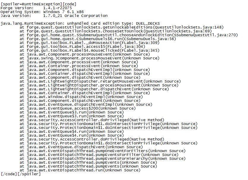 I can close the window with the error and keep on playing without any problems, just unlocking doesn't work. Playing duels/challenges and then trying again didn't solve the problem, neither did restarting Forge and windows.