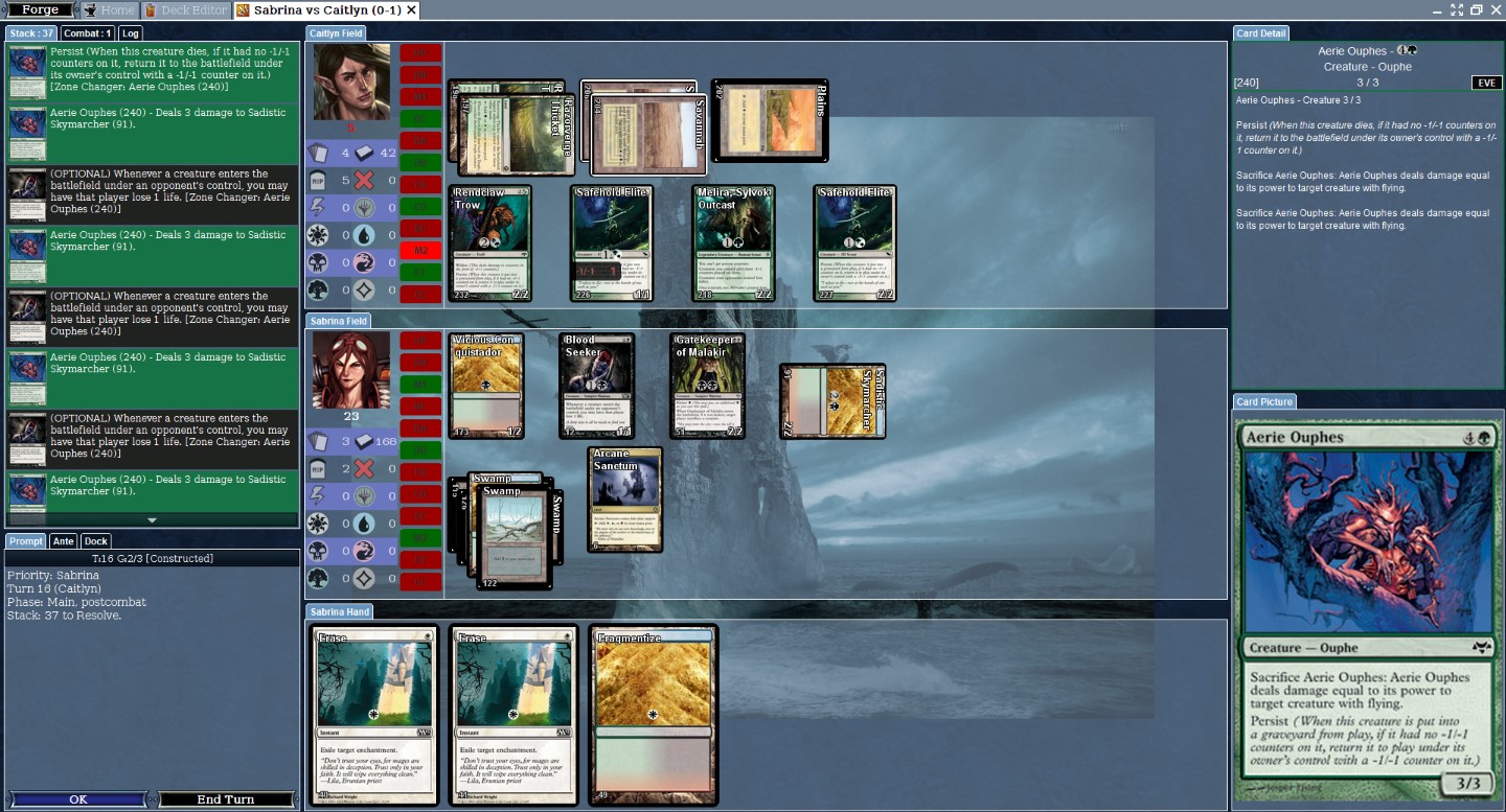 It's totally legal for the Ai doing it, but the others might look if the Ai can be taught not to do thatabbyjaneway wrote:The AI got stuck in a loop trying to sacrifice and persist Aerie Ouphes, as shown in the screenshot. Every time I clicked OK, the card appeared and disappeared from the battlefield and it added the same 3 items to the stack again.