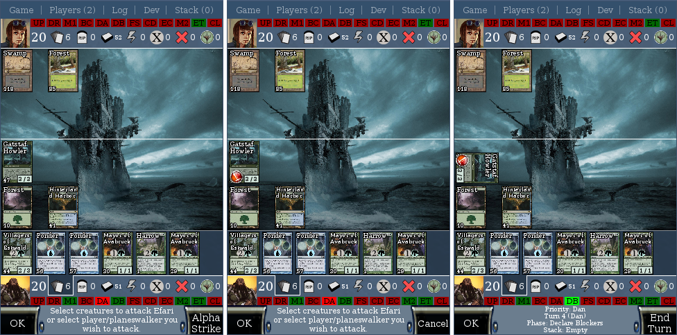 How about "Reset Attackers" instead of just "Cancel", I'm not sure I know what I expect Cancel to do. I'd be worried hitting Cancel will bypass my declare attackers step and not attack with anything.drdev wrote:So per some input I received, I decided to make use of the right prompt button to end the turn when you're prompted to pass priority, as well as make use of that button to either Alpha Strike or Cancel the attack (undeclare all attackers) when declaring attackers based on whether any attackers have been declared.