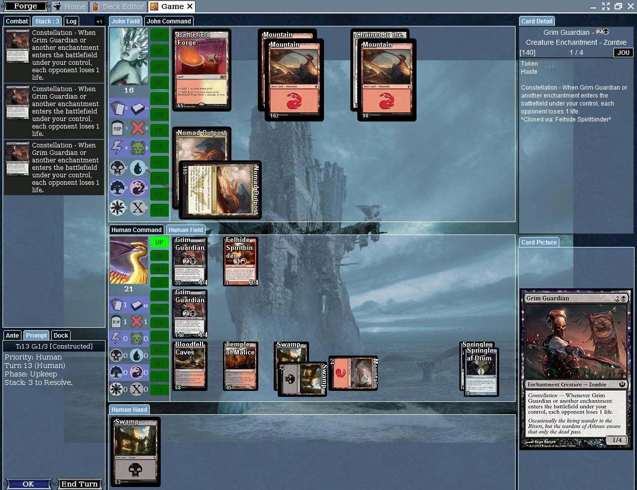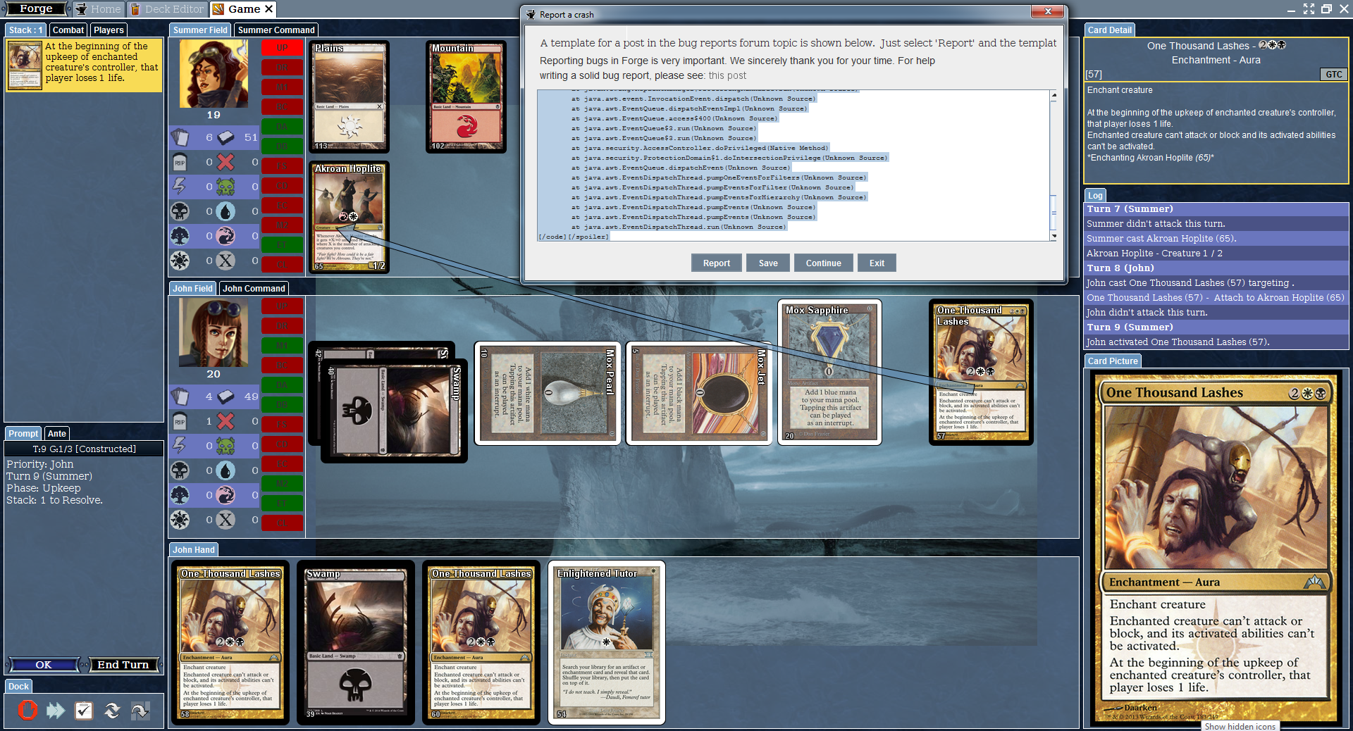 As I said above, this issue is fixed in the latest snapshot.Noah wrote:Just downloaded Forge on OS X 10.9. At some point in nearly every match, it'll give me this error as my opponent is resolving a spell(It has been Sunspring Expedition, Horrible Hordes). It also happened after the match ended once I killed myself with Moriok Replica.
