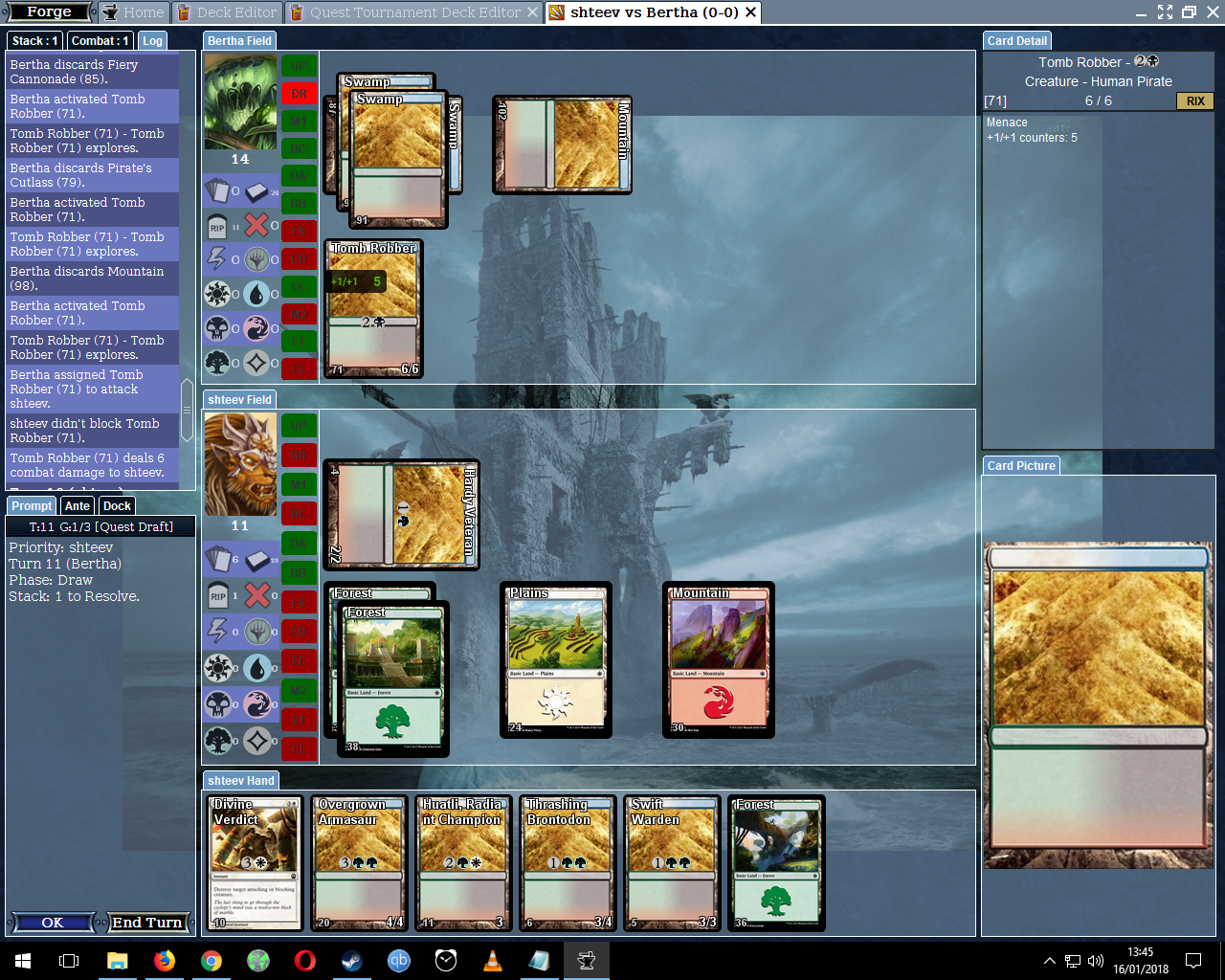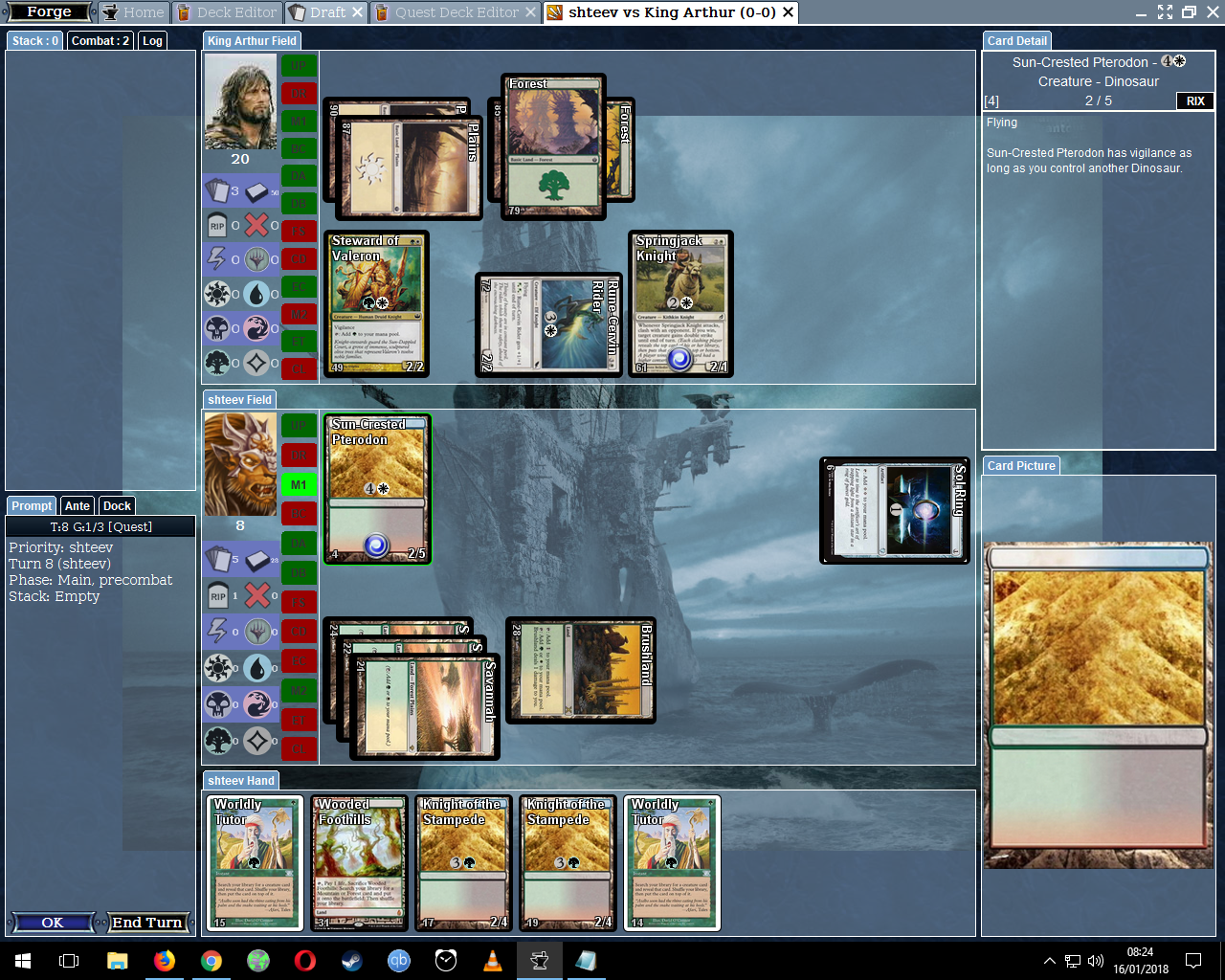 <edit> Ah, I think I know what the problem is: I was halfway through a draft in Quest Mode when I noticed that the Sun-Crested Pterodon didn't fly, and so to test it in game I created a second Quest (That was the quickest way to test the card, I thought), leaving the original draft open. I think Forge may have gotten confused with two different Quests being 'active'. I got a second error when I tried to quit the game.