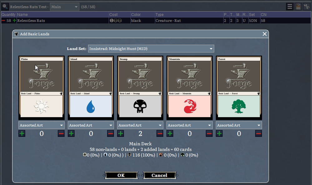 It is now possible to ask Forge to automatically suggest basic lands for your deck in the Add Basic Lands dialog of the deck editor. In desktop Forge, this is accomplished by double-clicking the statistics text in the bottom part of the dialog (hopefully someone will be able to code in a better, more intuitive way of doing this eventually). In mobile Forge, this is done by double tapping the statistics text. A tooltip is available in desktop Forge (and a hint text in mobile Forge) to make this feature more visible. Three deck sizes are supported by this algorithm: 40-card decks (if the number of cards in the main portion of the deck is less than 30, the algorithm will target a 40-card deck), 60-card decks (if the number of cards in the main portion is between 30 and 60, a 60-card deck will be targeted), and 100-card decks (if the deck is already above 60 cards when the feature is used, a 100-card deck will be targeted).