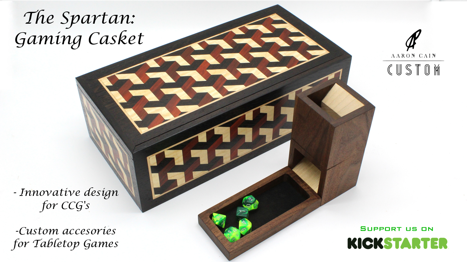 I plan to soon launch a new product on Kickstarter and I wanted some feedback from the community. The Spartan primarily is made with CCG's in mind but it can be used with other tabletop games as well. It has an innovative divider system, Suede lining, magnetic closure, and all of the boxes are individually numbered. The box can be made from more than 30 different exotic wood species. If you want I can send a link to the campaign preview. The forum is not letting me post the URL. I would love to hear what everyone thinks.