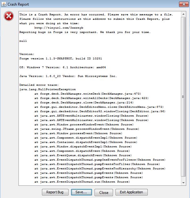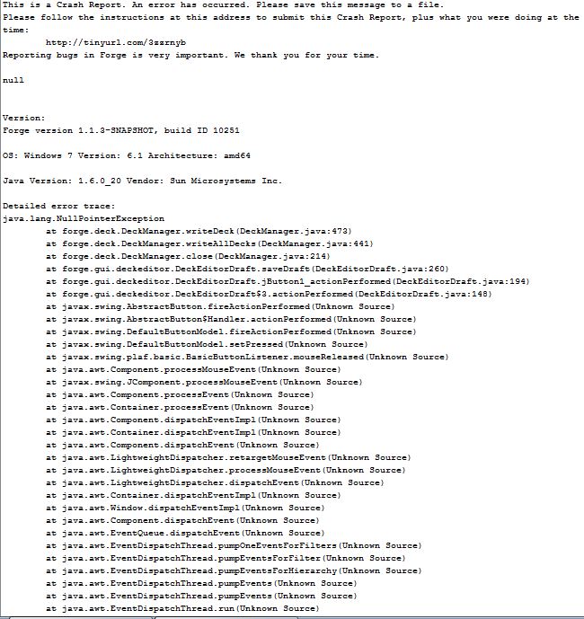 Any way, I was drafting Judgement-Torment-Odyssey and I got the following error report(1) when I tried to save it at the end. I tried to close the error report and pick the last card again, then it popped up again, so I saved the error report and closed the draft window, then I found that my draft had saved after all, it just hadn't closed on it's own. Then when I finished making my deck, I saved it, but when I closed the deck editor, I got another error report(2) and I had to exit forge altogether.