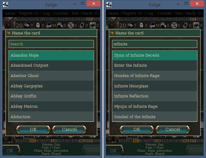 Here's an idea of what this looks like for the Add to Hand picker from the Dev menu, which lists all 13000+ cards in Forge and would be difficult to scroll through without searching capabilities: