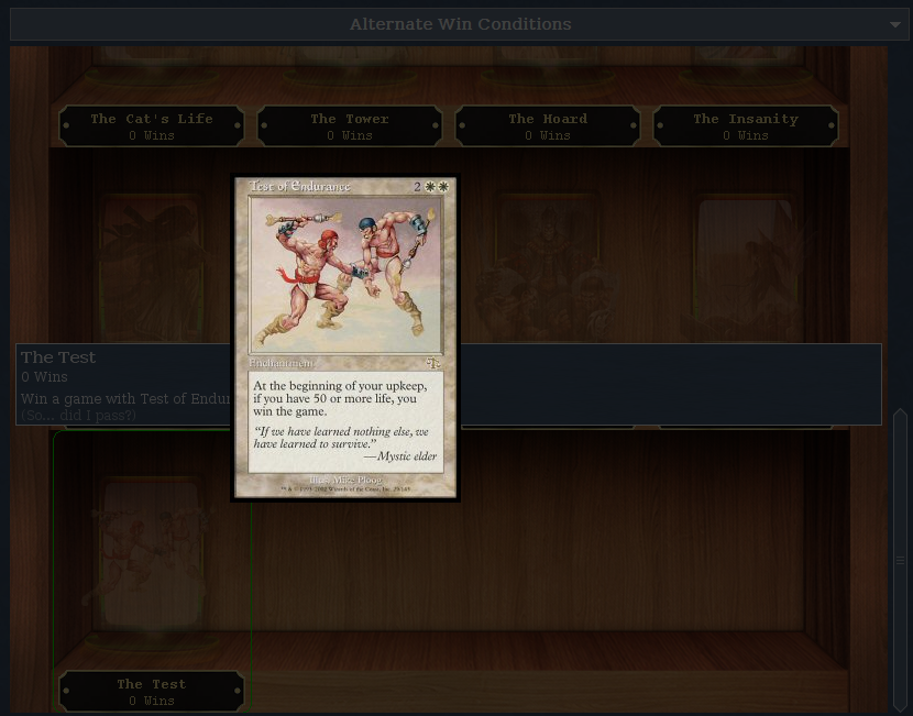I just added the achievement for Test of Endurance using the image provided by Rooger. On that note, I thought I'd point out that I also added support for double clicking or middle/long pressing trophies on the Alternate Win Conditions and Planeswalker Ultimates cases to show the card zoom for the associated card. This way there's a way to view the card you need to win the game with or activate the ultimate of without needing to go find it in the Deck Editor or something.