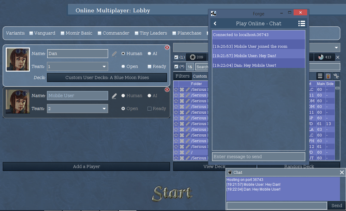 I can say that with the same two computers, we have been able to in the past, host & play with both Magic Work Station and XMage as well as some other kinds of games that aren't related to MTG.
