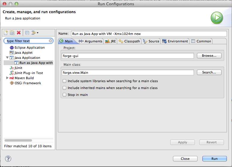 icon that is located above the type filter text object. Give an appropriate name in the name box. Then make sure that the Main tab is selected. Then enter the following data into the Project and Main class boxes: