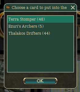 That wasn't actually an issue with the ListChooser, but rather that the prompt for that dialog wasn't being built properly in DigEffect.Agetian wrote:r24208: I noticed one more way the skinned list boxes misbehave: the titles of some of them (which indicate what exactly you're choosing) are cut short and there's no way to resize the list box to read the rest of the title. Sometimes it's crucial to understanding the effect you're choosing the card for, such as in the case of Telling Time where you're putting one card into your hand, one on the top of the library, and on on the bottom of your library. The following prompt may be somewhat confusing if you forgot the order of effects on the card or are unsure about what exactly the card is querying you about:telling-time.png