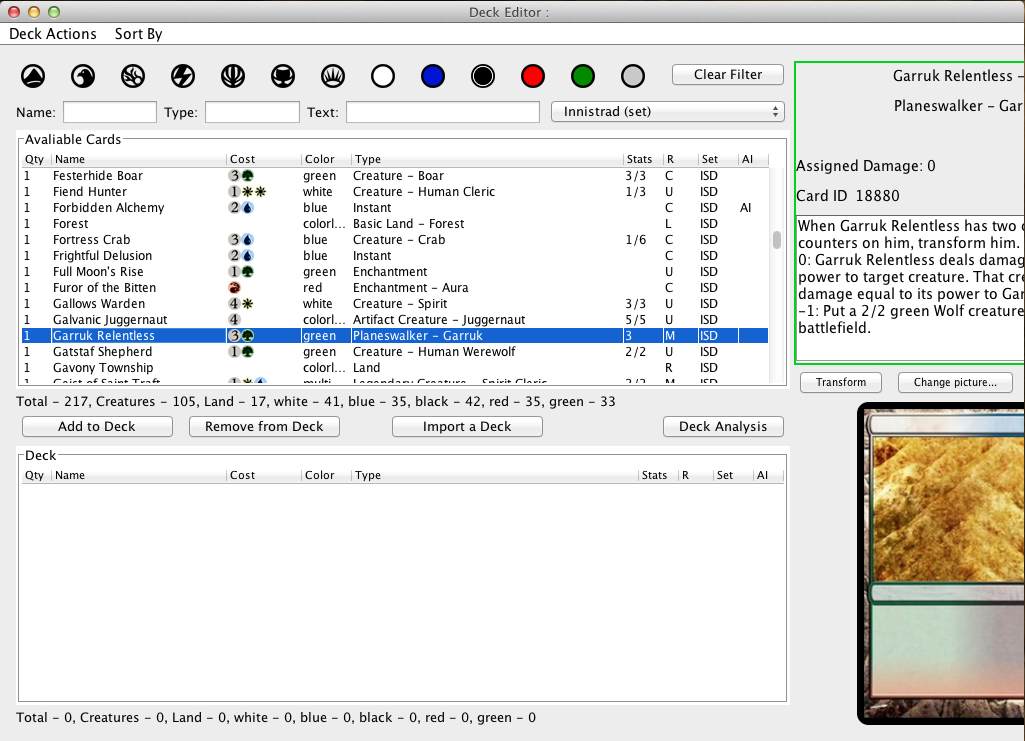 I play tested the test build last night for awhile. Good work Hellfish. I like the way you handled the flip/transform button in the deck editor.