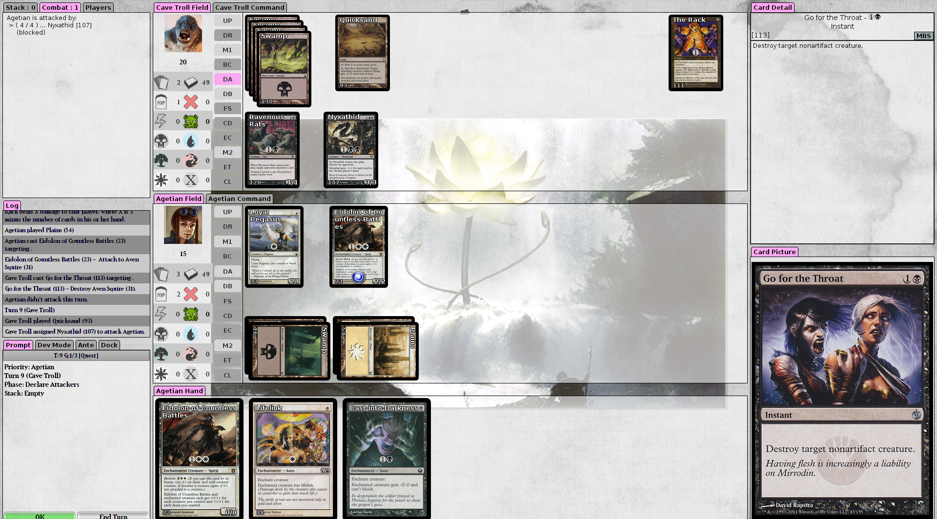 One more GUI visualization bug: the AI attacked me with Nyxathid but it did not register as an attacking creature (visually), though it's clear from the log that it's attacking. Interestingly, it correctly got tapped and an attacking icon appeared on it once I switched over to the "instants" part of the attacker declaration step. Then, in "declare blockers", it went back to untapped and no attacker icon. It then continued to glitch like that every turn, making it very difficult to realize whether it was attacking or not (moreover, its P/T were not always correctly represented on the card - it jumped between 3/3 and 7/7 every now and then, the former being the correct version).
