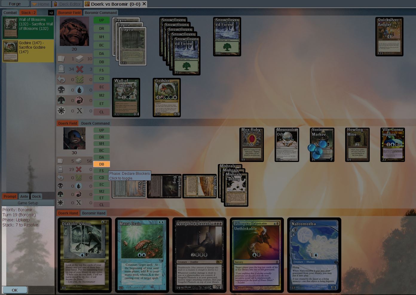 Even if it could cheat in that circumstance, it should bait the spell on the stack before gaining Hexproof.Agetian wrote:I noticed that the new experimental simulation AI incorrectly evaluates the ability of Prognostic Sphinx to gain hexproof - basically, the AI taps it every turn pre-combat for me (instead of attacking with it), even though I don't have anything relevant on my side of the battlefield to protect against it - all I had was a bunch of lands (Swamps). Granted, I had Hero's Downfall in my hand, so in case it could "cheat" and see the contents of my hand, maybe it sort of tried to protect against me casting it on the Sphinx, not sure about that...